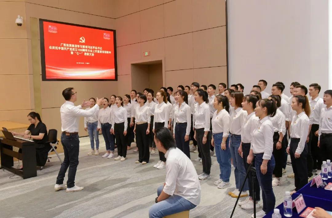 ▲大会正式开始前,广投集团合唱团献唱庆祝中国共产党成立100周年曲目《我爱你中国》